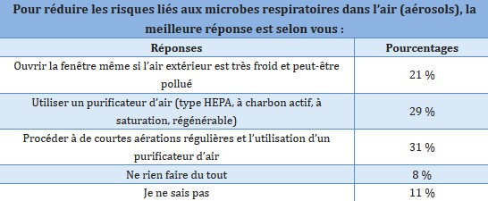 Les microbes circulent, mais les réponses montrent surtout… l’incertitude. La solution la plus efficace — aérations courtes + purificateur — n’est choisie que par 31% des personnes.
