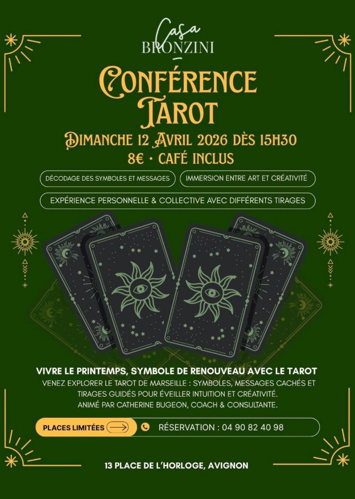 Dimanche 12 avril à 15h30, à la Casa Bronzini, place de l’horloge à Avignon, Catherine Bugeon proposera une immersion singulière dans l’univers du tarot de Marseille. Entre symboles, tirages guidés et exploration intuitive, cette conférence promet bien plus qu’une initiation : une expérience vivante, à la lisière du visible et de l’invisible. La conférence sera suivie de tirages collectifs, chacun apportant son propre tarot de Marseille. Réservation obligatoire au 04 90 82 40 98.