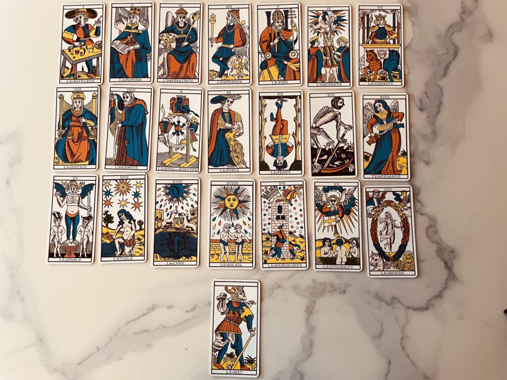 Car le tarot de Marseille ne se “lit” pas, il se déchiffre. Chaque couleur, chaque geste, chaque orientation raconte une dynamique. Le jaune solaire, omniprésent, n’est pas qu’une couleur : il éclaire ce qui devient conscient, ce qui sort de l’ombre. Le bleu, plus discret, évoque l’intériorité, la pensée, la profondeur silencieuse. Le rouge, lui, traverse les cartes comme un fil de vie : énergie, désir, incarnation.
