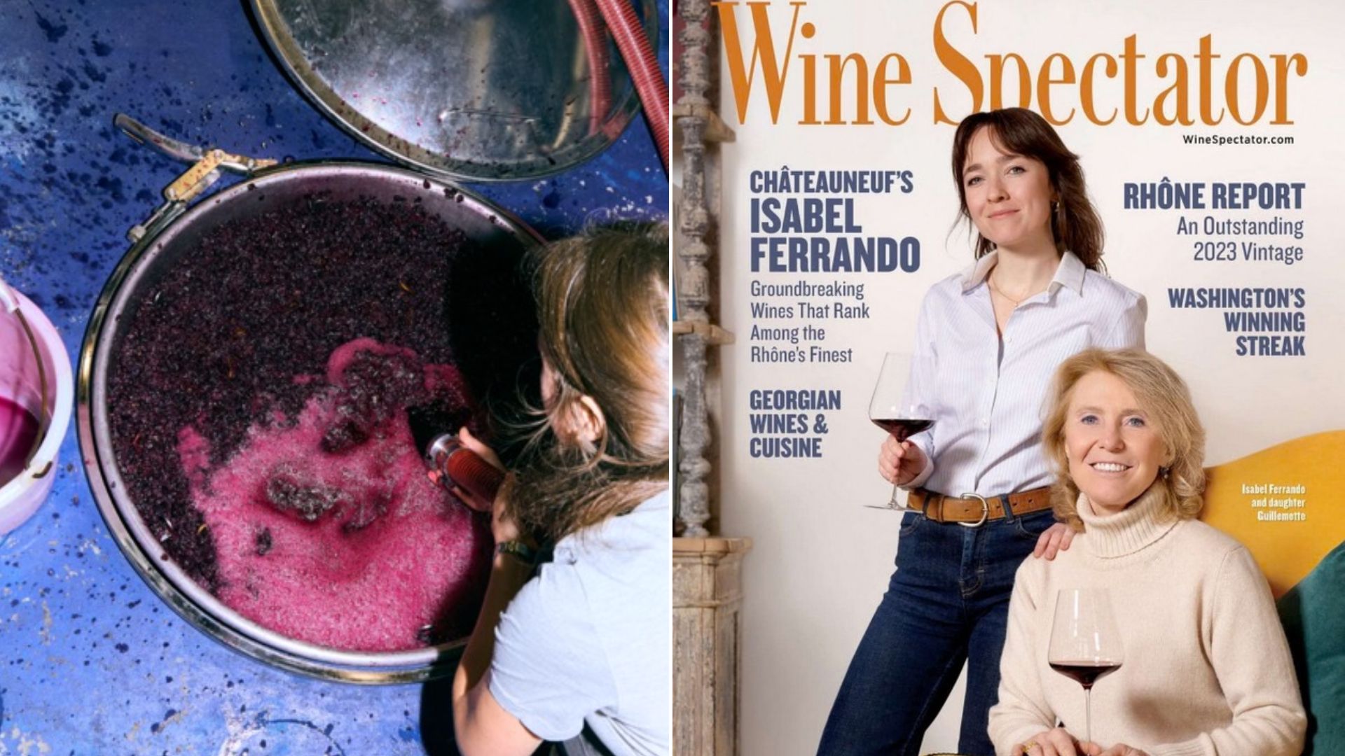 La maman et la fille, Isabel Ferrando et Guillemette Giraud Ferrando, sont en couverture de Wine Spectator, une référence sur papier glacé pour les vins de prestige et bien sûr les vigneron.n.e.s. qui les produisent. Un magazine américain reconnu pour son expertise en vins, publié à des millions d’exemplaires dans sa version papier et sa déclinaison digitale avec en titre « Châteauneuf’s Isabel Ferrando » parmi les meilleures Côtes du Rhône.