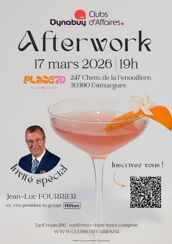 Afterwork Dynabuy Estézargues. Conférence de Jean-Luc Fourrier. Mardi 17 mars 2026, de 19h à 22h. Restaurant Place 70, Greet Hôtel Pont du Gard, 247 chemin de la Fenouillère, 30390 Estézargues. Coût : 25€ (repas compris). Inscription : obligatoire ici. Places limitées.