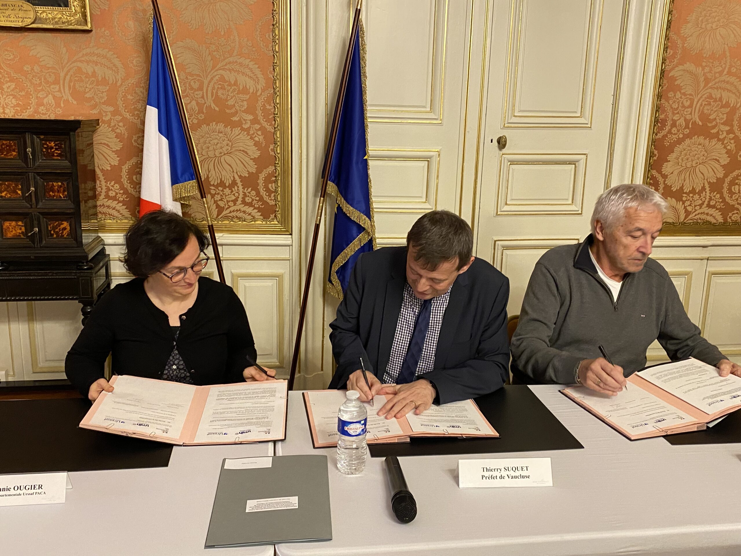 Stéphanie Ougier, directrice départementale employeurs de l’Urssaf Paca, Thierry Suquet, préfet de Vaucluse et Patrice Mounier, président de l’Umih 84 (Union des métiers et des industries de l’hôtellerie) ont signé une convention départementale de partenariat de lutte contre les tensions de recrutement et le travail illégal dans le secteur des hôtels, cafés et restaurants (HCR) en Vaucluse.