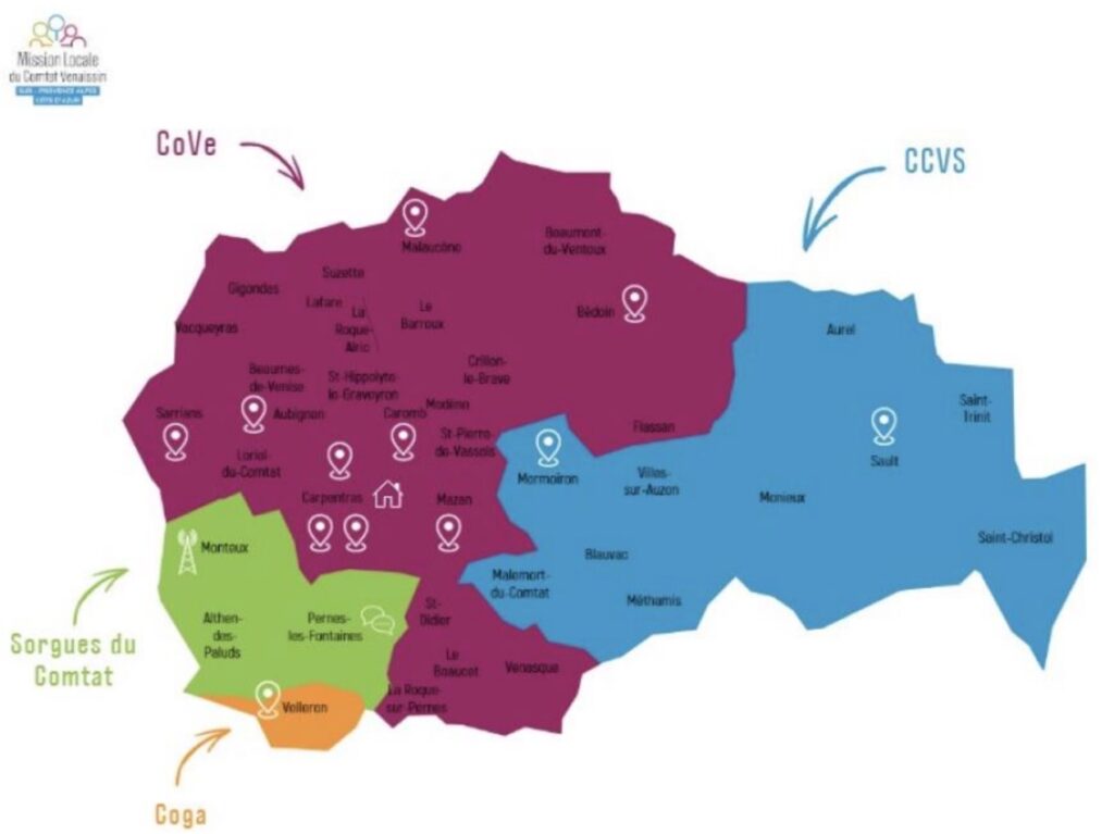 La Mission Locale du Comtat Venaissin œuvre au sein de quatre EPCI : le Grand Avignon, les Sorgue du Comtat, la CoVe, et la Communauté de Communes Ventoux Sud.