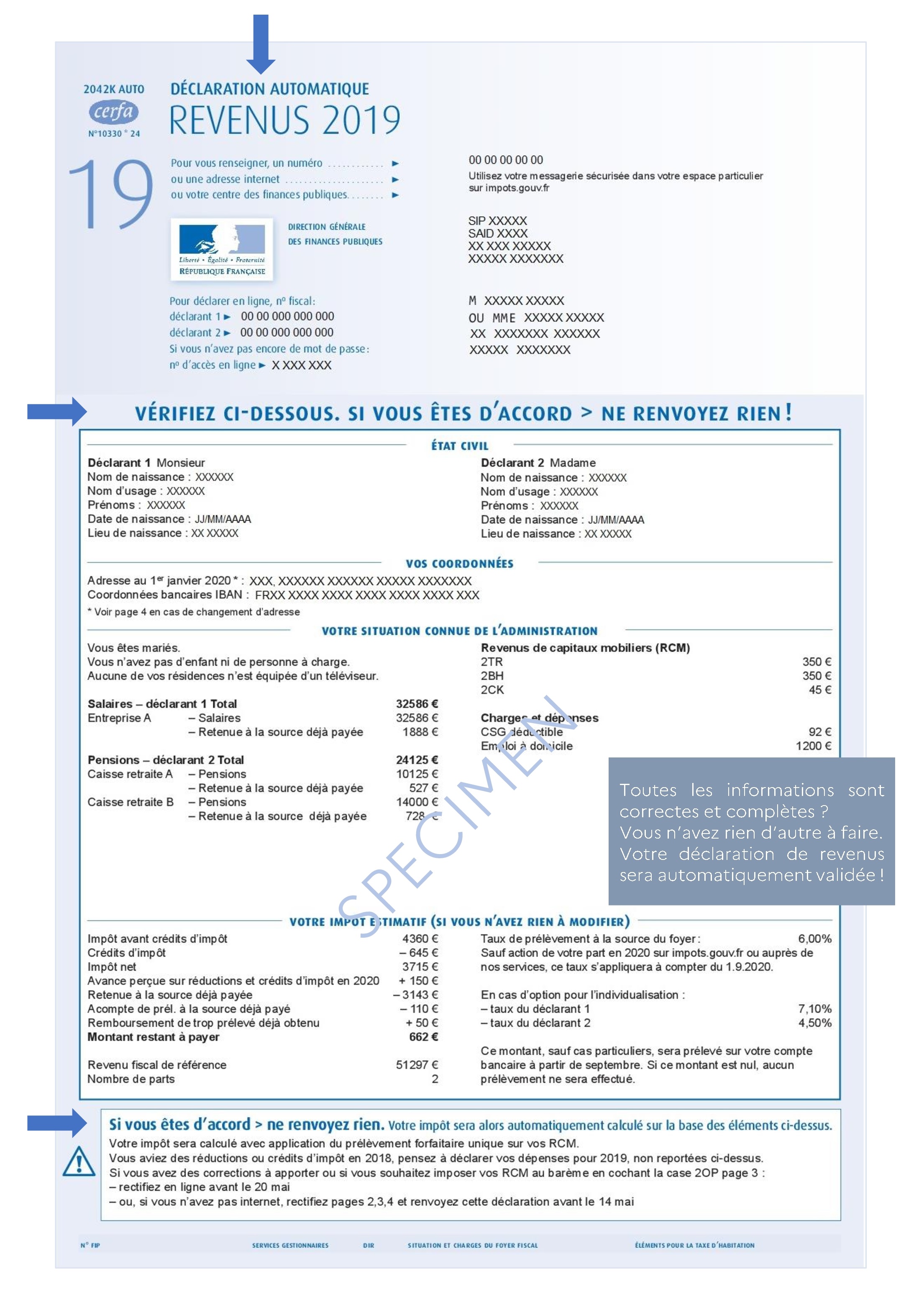 « Pour déclarer, il suffit de vérifier », se plaît à rappeler le ministre de l’Action et des Comptes publics. En effet, depuis plus de 10 ans, l’administration fiscale préremplit la déclaration de revenus grâce aux informations dont elle a connaissance (charges de famille, montant des salaires, retraites, indemnités, allocations chômage, etc.). Cette année, une nouvelle étape est franchie pour simplifier la vie des usagers en proposant à 12 millions de foyers fiscaux de ne plus déposer leur déclaration dès lors que l’administration fiscale dispose de toutes les informations nécessaires à la taxation de leurs revenus.