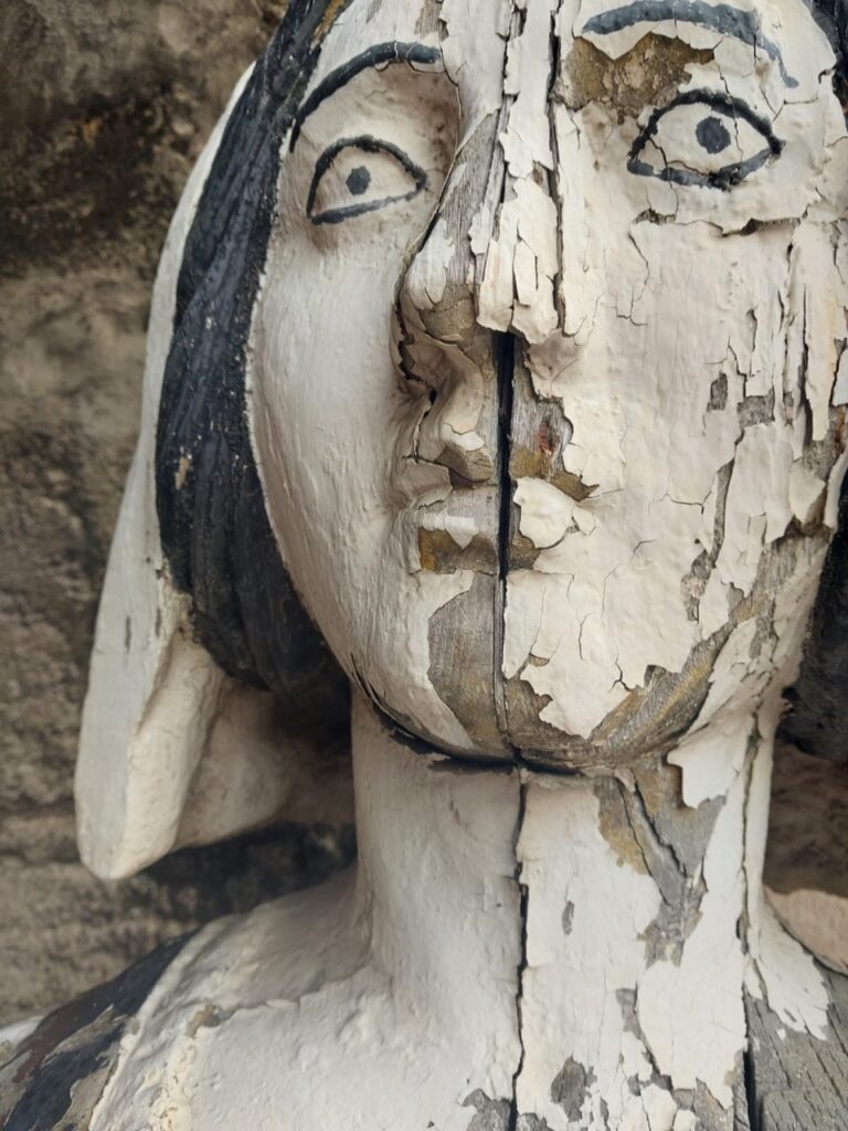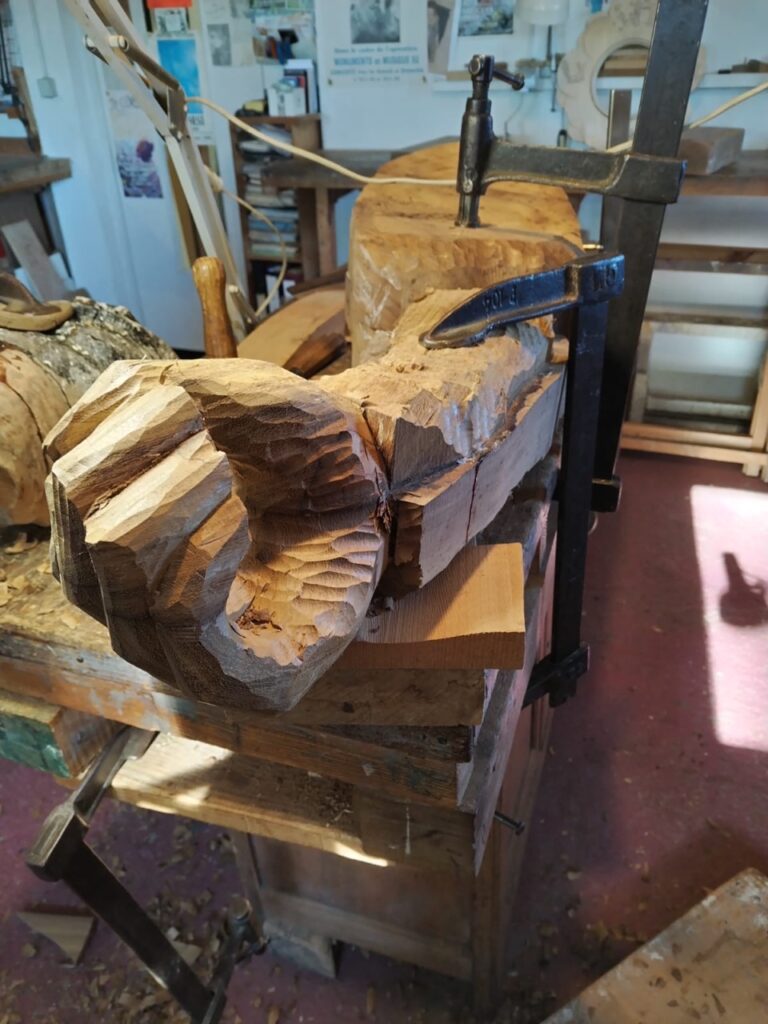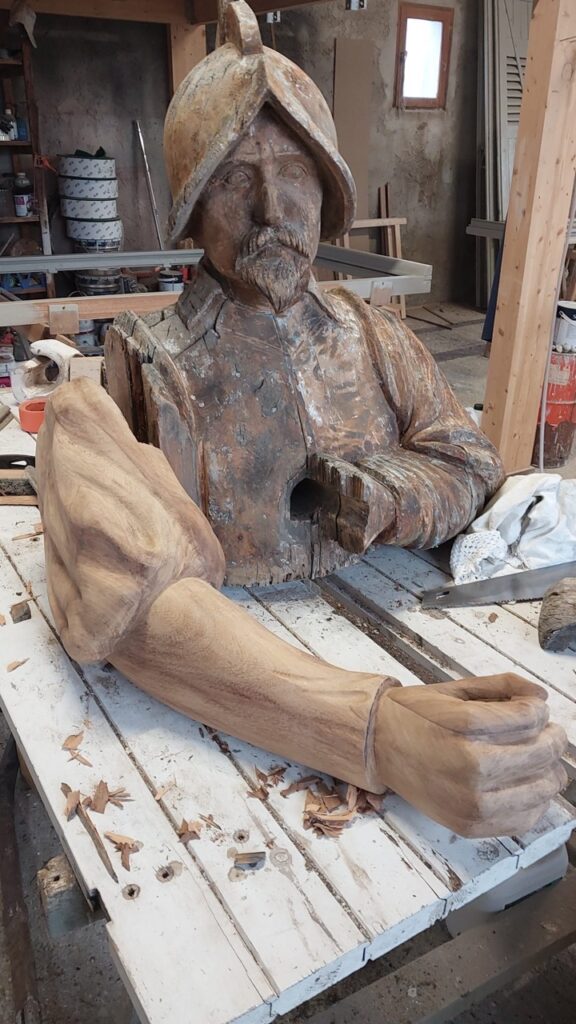 « Les amoureux de bois qui pèsent autour de 200 kg ont été descendus du clocher début octobre grâce à une grue, explique Michel Edoli. Une fois transportés chez nous, avec l’équipe, nous avons démonté chaque pièce, bras, pieds, têtes, mains. Nous avons décapé le bois qui était en lamellé-collé et qui au fil du temps, depuis la dernière rénovation, quand Avignon était la Capitale Européenne de la Beauté en 2000, a subi les outrages du temps et les caprices de la météo, entre mistral, soleil brûlant et pluie. Avec un décapeur thermique, nous avons ôté toutes les couches de mastic, de colle, de résine, de peinture desséchées qui se sont fissurées, décollées et ont été rongées par le temps. Nous avons utilisé du sapin de qualité et pour qu’il tienne longtemps nous lui avons fait boire une bonne quantité d’huile et de peinture pour le protéger. »