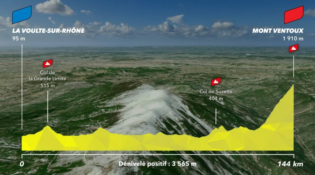 Cette étape se déroulera le vendredi 7 aout entre La Voulte-sur-Rhône et le Ventoux. Au menu de cette 7e étape : 3 565 mètres de dénivelé sur les 144km du parcours qui gravira le mont solitaire par Bédoin.