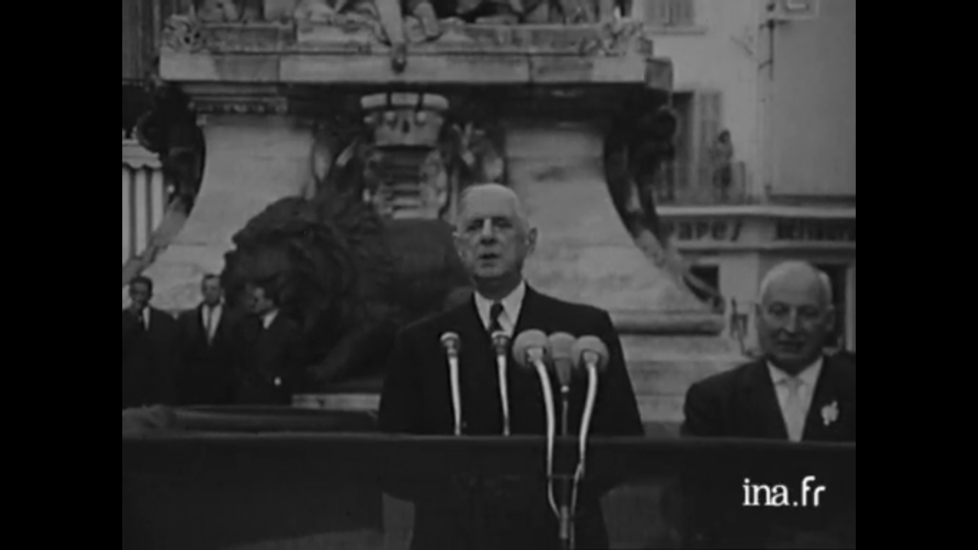 Le Général De Gaulle en 1963 sur la place de l'Horloge en compagnie du maire d'Avignon Henri Duffaut. © INA
