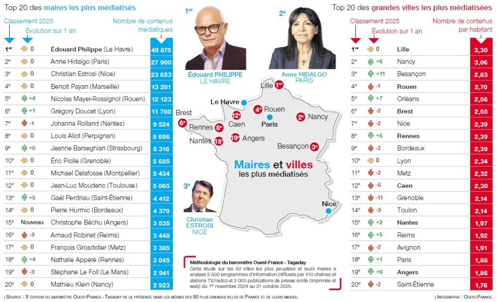 Etabli à partir du classement des 50 premières villes de France en fonction du nombre d’habitants et de la liste des maires de ces communes, ce classement réalisé en partenariat avec la plateforme Tagaday de la société française Aday est élaboré à partir d’un ratio contenus/population. Pour cela, le baromètre Ouest-France/Tagaday s’appuie sur la base de l’analyse de plus de 5 500 programmes d’information (diffusés par 410 chaînes et stations TV/radio pour une moyenne de 2 400 heures quotidiennes) et d’une sélection de 3 000 publications de presse écrite (titres de la presse imprimée et sites web éditoriaux) entre le 1er novembre 2024 et le 31 octobre 2025.