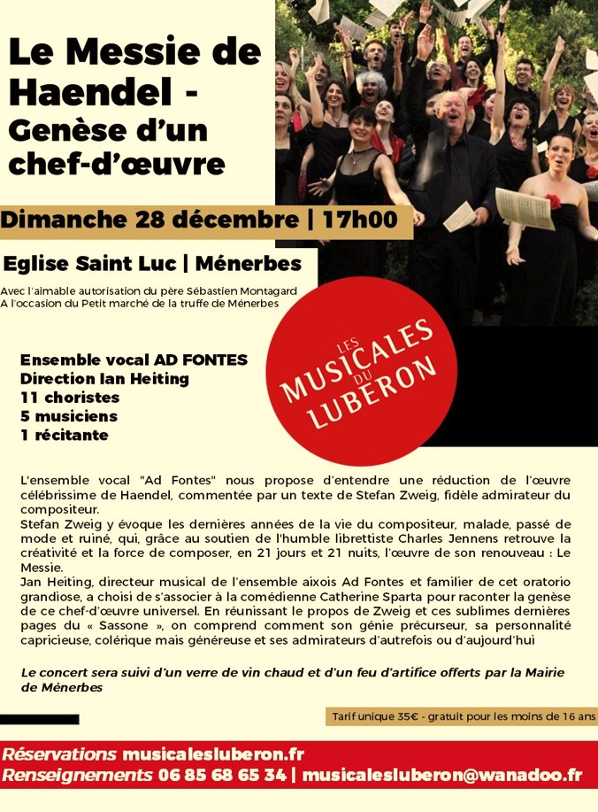Le 28 décembre, les Musicales du Luberon renouent avec leur concert de Noël à l’occasion du Petit marché de la truffe de Ménerbes. Cette année, l’ensemble vocal ‘Ad Fontes’ propose une relecture sensible et éclairante du ‘Messie‘ de Haendel, mêlant musique, récit et patrimoine, avant un feu d’artifice et un vin chaud offerts au public.