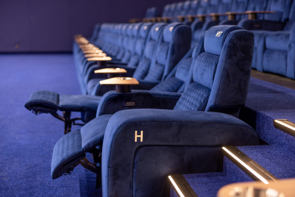 Paradoxalement, il y a plus de place pour chaque cinéphile mais moins de places puisqu’on est passé de 220 sièges à 135 fauteuils de velours bleu, électriques, moelleux qui peuvent s’incliner à l’horizontale, avec sur l’accoudoir, un chargeur USB, mais aussi un porte-gobelet acier et une tablette qui pivote pour y poser du pop-corn.