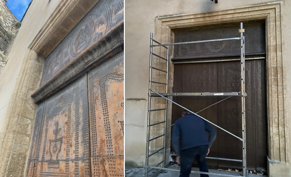 Œuvre originale réalisée autour de 1870, la porte de l’église se distingue par son placage métallique clouté et ses motifs décoratifs rares en Provence. Elle constitue l’un des éléments les plus singuliers de cet édifice roman du XIIᵉ siècle, profondément remanié au fil des siècles. Fragilisée par le temps, la porte nécessitait une restauration complète, mêlant savoir-faire artisanal et respect du patrimoine ancien. Le chantier, engagé à l’automne 2025, vise à consolider la structure en bois, restaurer le revêtement métallique et redonner à l’ensemble sa cohérence esthétique. Le montant total des travaux s’élève à 24 200€, dont une part significative a pu être financée grâce à la souscription.