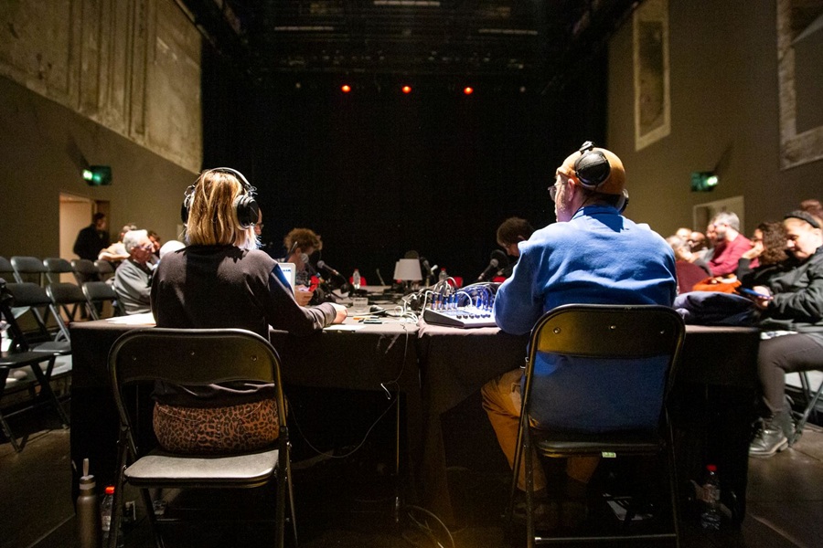 Expérimenté en 2024, le partenariat avec Magma Collectif de Montpellier se poursuit. La salle du Tinel va de nouveau être transformée en studio de radio, prêt à recevoir les lectures, des entretiens, des feuilletons radiophoniques, des tables rondes et les émissions pastichées telles que « Bas les masques » ou « Qui veut gagner des 1000 pièces. » Pendant 4 jours , le Tinel est ouvert de 18h à 23h, on y vient quand on veut, quand on peut ou on reste chez soi en se connectant sur la web radio, radio JET welove.radio. « C’est ce mode rapprochement entre l’intime , la personne et la littérature qui m a donné envie de pousser le format radio. La radio est bénéfique à la littérature, l ‘histoire de la radio depuis 1940 le prouve avec des émissions phares. Si on connaît ou si on a l’impression de bien connaître des auteurs de roman c’est grâce à des émissions radiophonique, c’est un véritable partenaire du théâtre », précise avec passion et conviction Marianne Clévy.