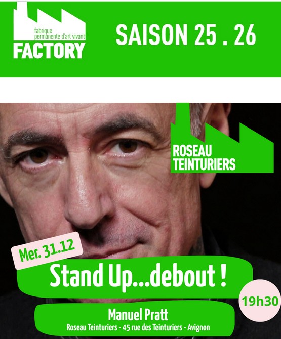 Manuel Pratt – Stand-up. Mercredi 31 décembre à 19h30. 1h10. La Factory – Salle Roseau Teinturiers, 45 rue des Teinturiers, Avignon. Plein tarif 20€ / Tarif réduit (étudiants, demandeurs d’emploi, minima sociaux) 15€. Renseignements & billetterie : la-factory.org – 09 74 74 64 90