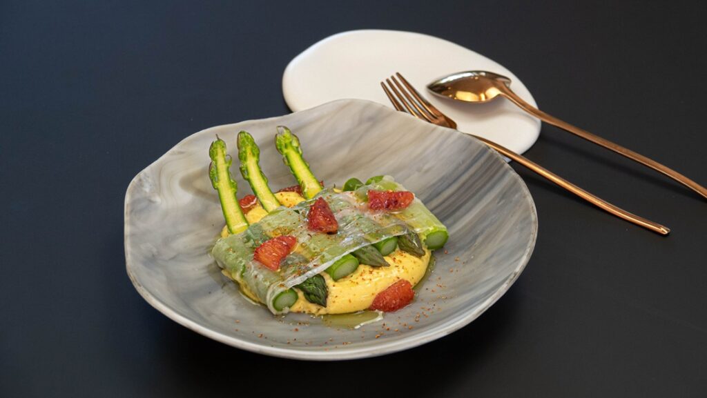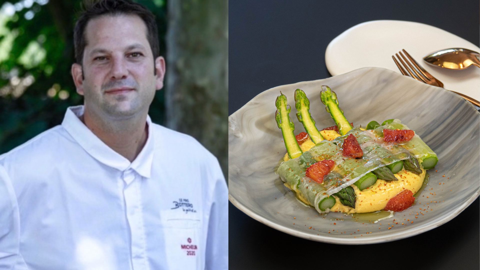 Nicolas Bottero est le propriétaire et le chef de cuisine du restaurant étoilé Le Mas Bottero, situé à Saint-Cannat, dans les Bouches-du-Rhône. Pour régaler vos papilles et celles de vos proches, il vous dévoile sa recette d’asperges vertes de Provence avec voile de Colonnata et sabayon à l’orange.
