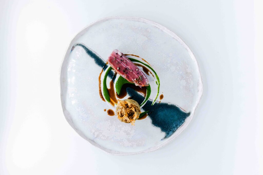 Disposer à côté une tranche d’agneau nappée de son voile de guanciale.