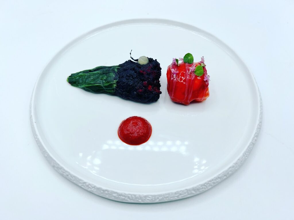 Couper les queues en ¾ – ¼ comme sur la photo ci-dessous. Sur la partie haute du homard, glacer 3 fois avec le glaçage poivron rouge qui a été préalablement légèrement re-tempéré (il faut toujours que le homard avant de le glacer soit bien froid pour que cela colle rapidement). Une fois le glaçage effectué, y déposer à l’aide de la pipette la purée de framboises, y mettre dessus fleur de basilique, feuille de capucine, t feuilles de nepita. Prendre la 2e partie du homard, la recouvrir de feuilles de pak choï ou épinards. Bien l’assaisonner avec citron vert piment d’Espelette et fleur de sel. Tremper la moitié dans la tempura d’encre de seiche et faire frire 30 secondes à 180°C. La sortir et la déposer sur un papier absorbant.