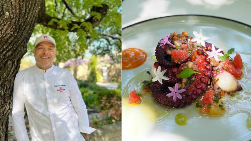 Christophe Chiavola est le chef du restaurant Le Prieuré, à Villeneuve-lès-Avignon. Pour régaler vos papilles et celles de vos proches, il vous dévoile sa recette de poulpe à la braise avec nectarine et vierge de légumes au miel.