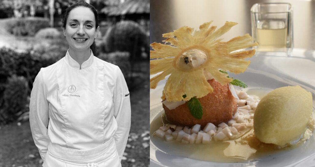 Alaïs Vaubourg est la cheffe pâtissière du restaurant La Cabro d’Or de Baumanière, aux Baux-de-Provence. Pour régaler vos papilles et celles de vos proches, elle vous dévoile sa recette du dessert à l’ananas et à la jeune noix de coco fraiche.