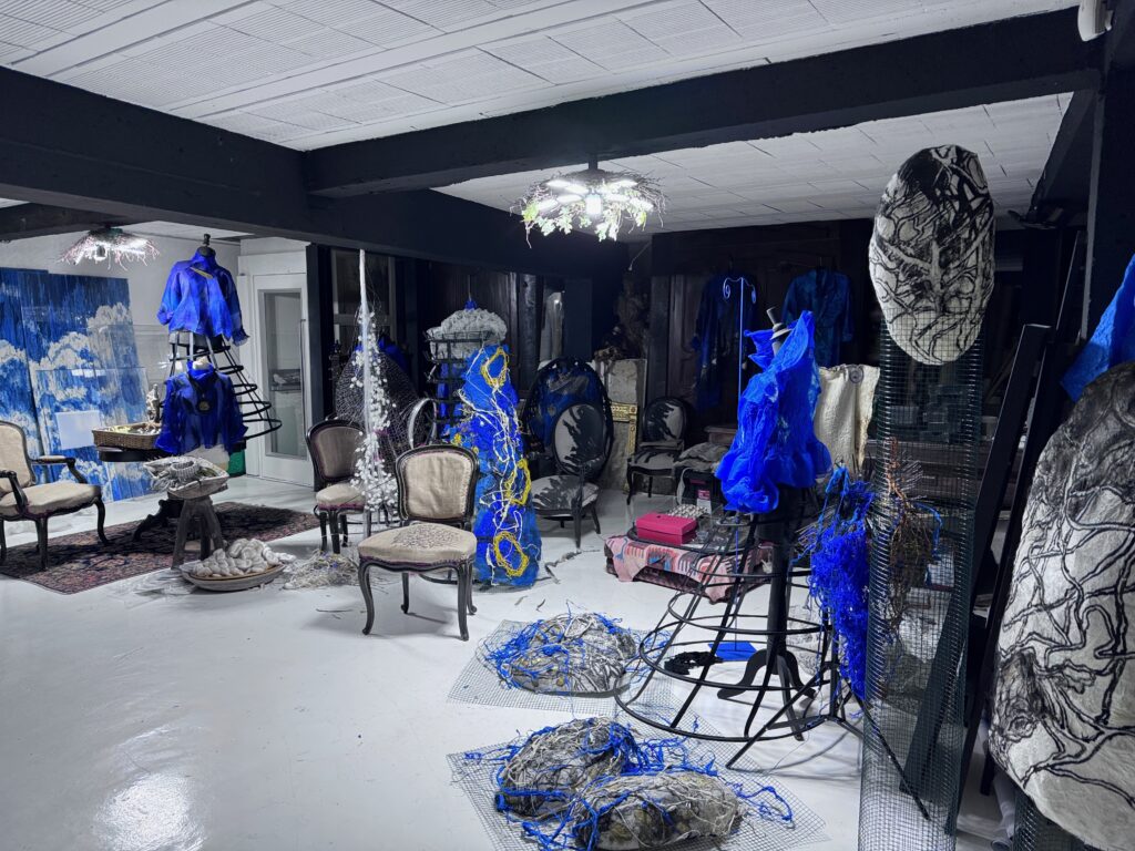 Au cœur du projet, il y a la fascination pour le vivant. Le cocon, motif récurrent, devient une métaphore de la transformation : une enveloppe fragile renfermant une métamorphose radicale. Joanna Staniszkis a elle-même élevé des vers à soie pour comprendre ce cycle, observer la naissance, la disparition, la mutation. À cette approche quasi scientifique s’ajoute une dimension poétique : les œuvres exposées sont en partie issues de parachutes militaires en soie, retrouvés sur un marché d’antiquités. Déconstruits, teints, recomposés, ces fragments deviennent matière artistique. Le bleu domine comme le bleu du ciel, le bleu marial, le bleu profond, visuelle et symbolique.