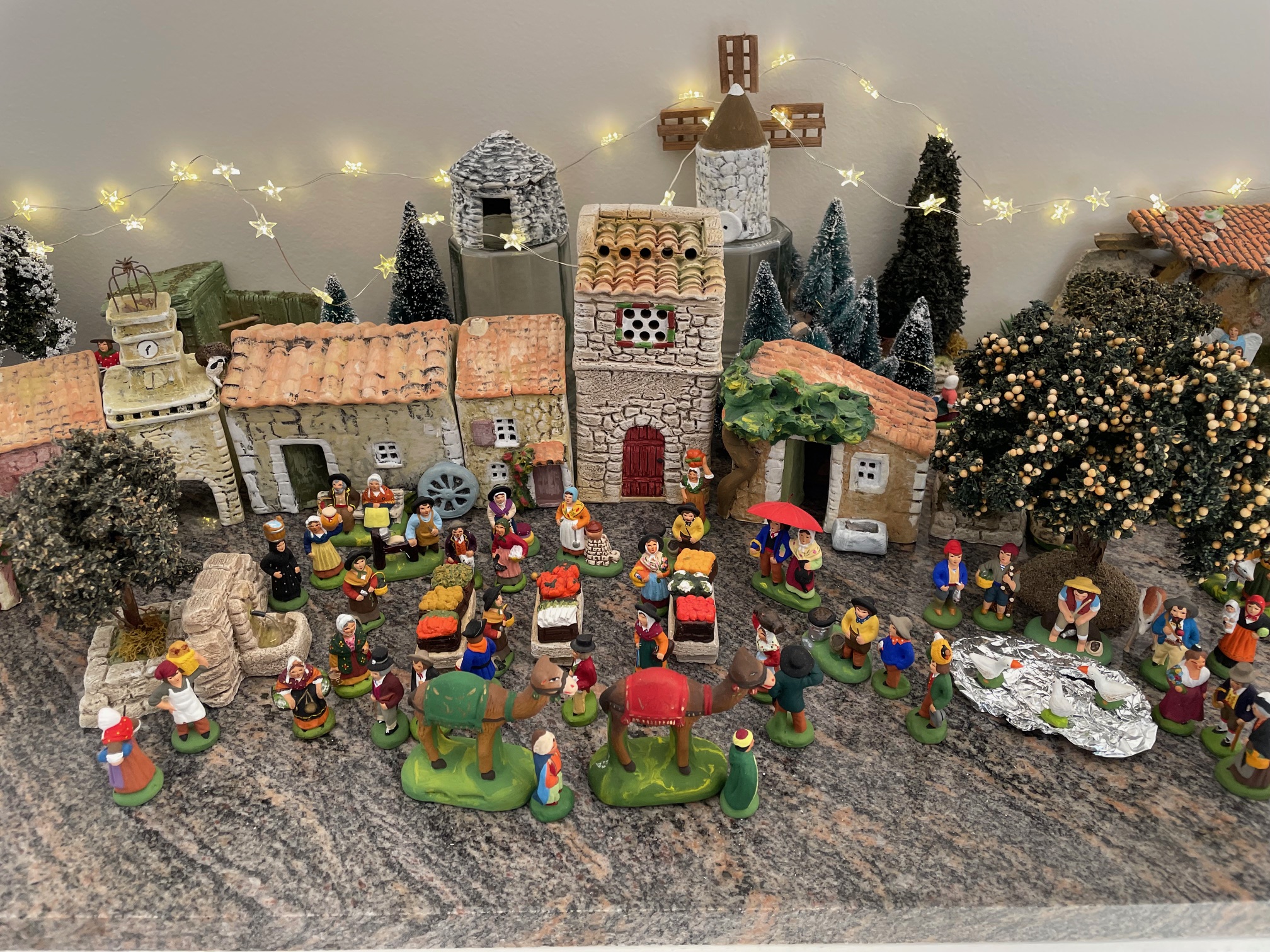 Chaque santon raconte une histoire : le boulanger, la lavandière, le berger, l’âne patient… Des figurines simples mais trempées de terroir. Certains sont non décorés, prêts à être peints, d’autres déjà habillés avec minutie. Ajoutez à cela les décors, les accessoires (ponts, fontaines, arbres, rochers…) : l’ensemble compose une crèche digne d’un tableau vivant et rassurant de notre passé, des personnes présentées ou de celles qui nous ont quittées mais qu’on semble retrouver dans ce petit monde magique.
