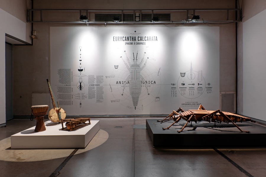 Nous sommes accueillis dans le hall par la photo du Dodo ressuscité par France Cadet, ce fameux oiseau mystérieux de près d’un mètre de long disparu au XVII e siècle. Grâce à la technologie de notre smartphone nous pourrons réentendre son cri. France Cadet nous alerte également sur les manipulations dont les animaux sont l’objet : clonage et manipulation génétique,  en leur attribuant des plaintes, des cris qui interagissent avec nos déplacements : une exposition de trophées de chasse menaçants ou un « Botched Dollies », petit robot chien-vache-brebis. Dans une première salle, on pourra aller à la rencontre de deux animaux particulièrement communicants : le pigeon voyageur et le poulpe. L’œuvre de Nicolas Darot présente un automate sonore pigeon voyageur « Prince Vaillant » qui rappelle le rôle primordial joué par ces volatiles lors de la Première Guerre Mondiale. Le poulpe bien connu pour ses qualités fascinantes est évoqué par le documentaire du biologiste  Jean Painlevé (1902-1989). Le collectif ‘Tout reste à faire’ a installé une de leur dernière création, un phasme géant composé d’instruments de musique d’Afrique de l’Ouest , qui  communique en musique et nous interpelle sur la préservation et le recyclage du vivant. Aurae du Collectif LAB212 est une installation monumentale spécialement conçue pour cette exposition : au sein d’un cube noir, vide, comment représenter un espace où est recréé un mystérieux écosystème qui évoluera pendant notre propre déplacement, selon des règles ou au contraire d’une manière complètement aléatoire ? Avec le film d’animation Le jardin d’amour de la marseillaise Dominique Castell on assiste à une étrange parade amoureuse. L’artiste suédois Erik Bunger nous présentent 2 films explorant les liens inédits entre le langage animal et le cinéma hollywoodien. Les appeaux accrochés à la « Tunique du piégeur » du roumain Daniel Spoerri modélise l’impossibilité de l’interaction que nous recherchons avec le monde animal.