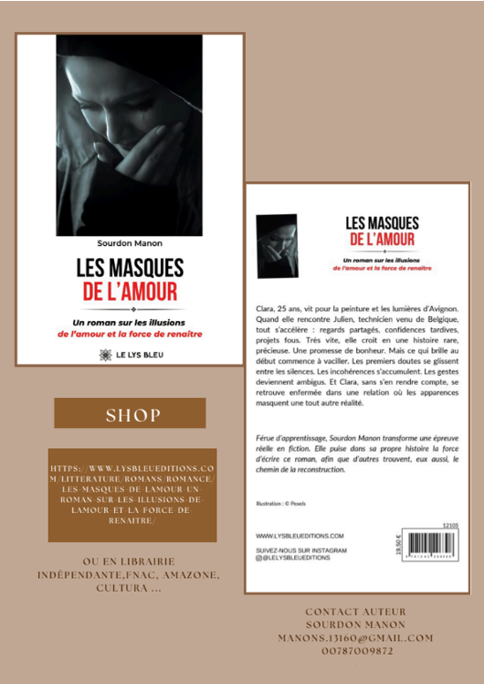 L’autrice avignonnaise, Manon Sourdon publie son premier ouvrage, ‘Les masques de l’amour’, aux éditions Le Lys Bleu. Un roman intime et engagé, qui explore les mécanismes de l’emprise amoureuse et le long chemin vers la reconstruction de soi. Ce roman autobiographique s’inscrit dans la lignée des récits contemporains qui donnent à voir ce que les violences psychologiques laissent rarement paraître : des blessures invisibles, durables, et souvent silencieuses.