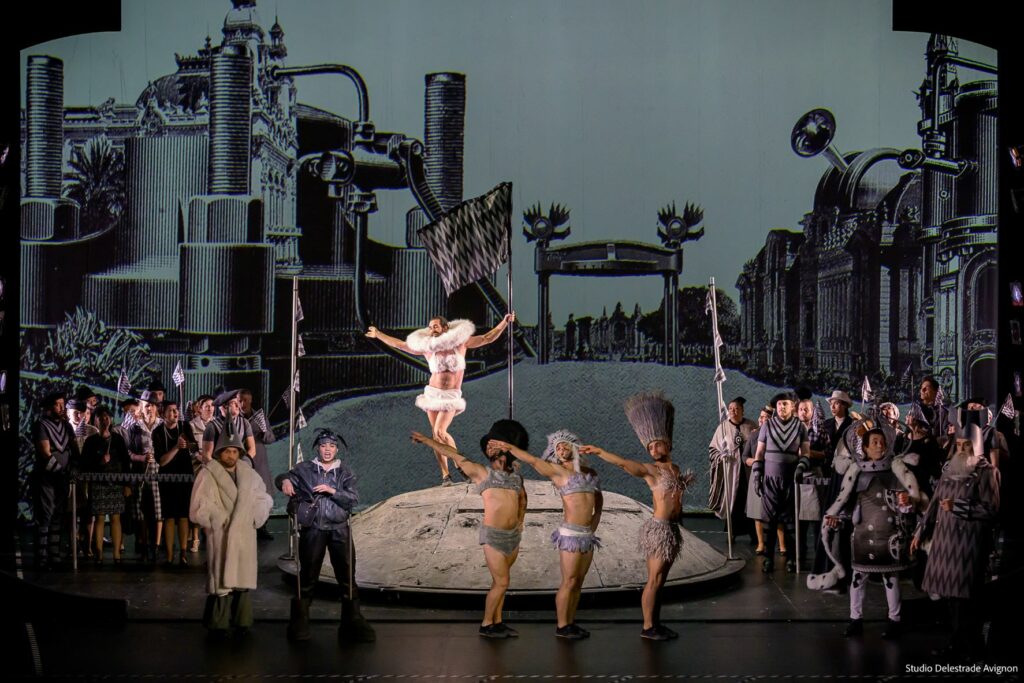 Le plateau de l’Opéra Grand Avignon était pour l’occasion la scène d’un tournage cinématographique à la manière du « Voyage dans la lune » de Georges Méliès (1902) tout en retrouvant les péripéties des personnages «De la terre à la Lune» de Jules Verne (1865). Créé en 1875, l’Opéra féerie de Jacques Offenbach nous interpelle encore aujourd’hui sur notre soif de découvertes tout en nous croyant le centre du monde !