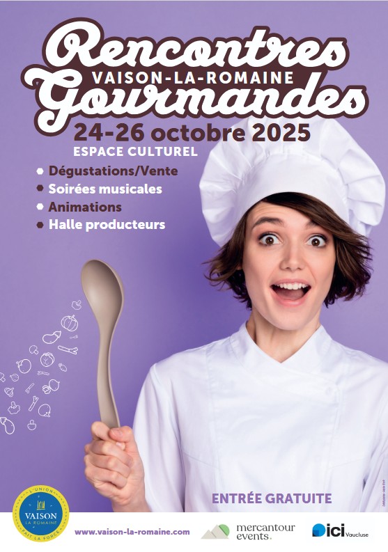 Les Rencontres Gourmandes de Vaison-la-Romaine. Espace culturel Patrick-Fabre, Place François Cévert. Vendredi 24 octobre de 16h à minuit (inauguration à 18h30). Samedi 25 octobre de 10h à minuit. Dimanche 26 octobre de 10h à 19h. Entrée libre – Verre “collector” : 2€. Programme complet sur www.vaison-la-romaine.com.Tout le programme ici.