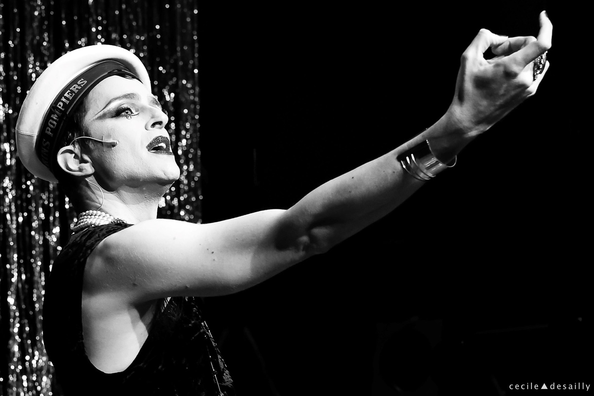 Olivire Normand incarne un androgyne poétique vêtu d’une robe noire de velours, entre Barbara, Greta Garbo et David Bowie. C’est drôle, émouvant mais aussi poétique et érudit.