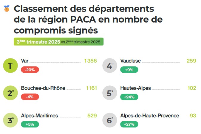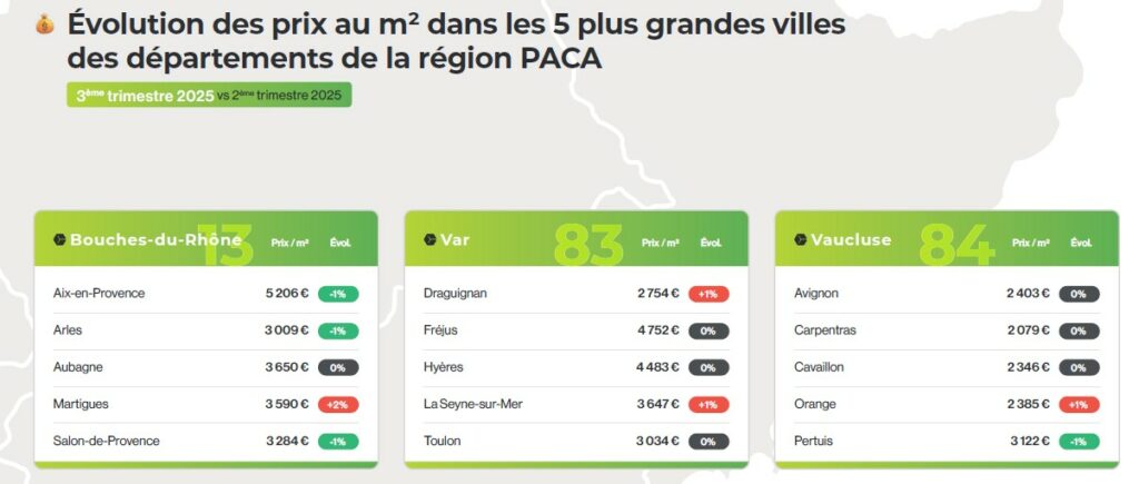 Sur l’ensemble de la région Provence-Alpes-Côte d’Azur, la situation reflète en partie celle du Vaucluse, avec toutefois quelques spécificités : Les compromis en recul malgré une demande toujours réelle. Contrairement à la tendance nationale, où les compromis signés progressent, la région Provence-Alpes-Côte d’Azur enregistre un recul de –8 % sur le trimestre. Un chiffre qui interroge, dans une région pourtant très attractive, entre mer, montagne et soleil. Mais là encore, ce sont les conditions de financement qui pèsent lourd : les acheteurs doivent composer avec des taux d’intérêt élevés et des prix au m² souvent supérieurs à la moyenne nationale.