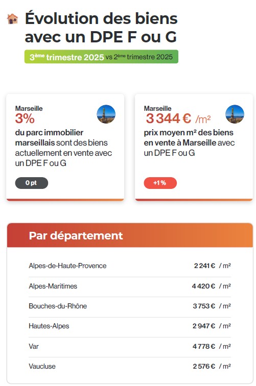Autre enjeu de taille : les logements classés F ou G au DPE (diagnostic de performance énergétique), souvent plus difficiles à vendre. Dans le Vaucluse, ces biens représentent une part non négligeable du parc. Bonne nouvelle, malgré leur profil peu attractif, leurs délais de vente reculent de 26 jours, leur taux de casse (transactions abandonnées) diminue, et les compromis signés augmentent de +8 %. Mais leurs prix continuent de baisser légèrement (–2 %).