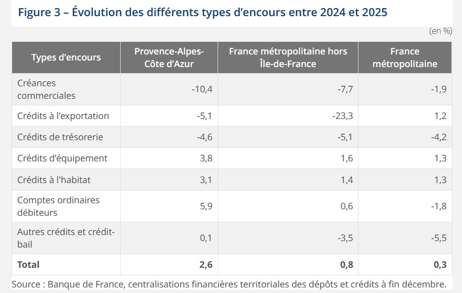 « En 2025, l’encours total des crédits bancaires atteint 182 milliards d’euros en Provence-Alpes-Côte d’Azur, enregistrant une hausse de 2,6% par rapport à l’année précédente, indiquent Julie Argouarc’h et Corinne Roche dans leur synthèse. Cette hausse survient après un léger repli en 2024 de 0,7%, le premier depuis le début de la série il y a 15 ans. Le rebond est plus marqué que pour la France métropolitaine hors Île-de-France (+0,8%). »