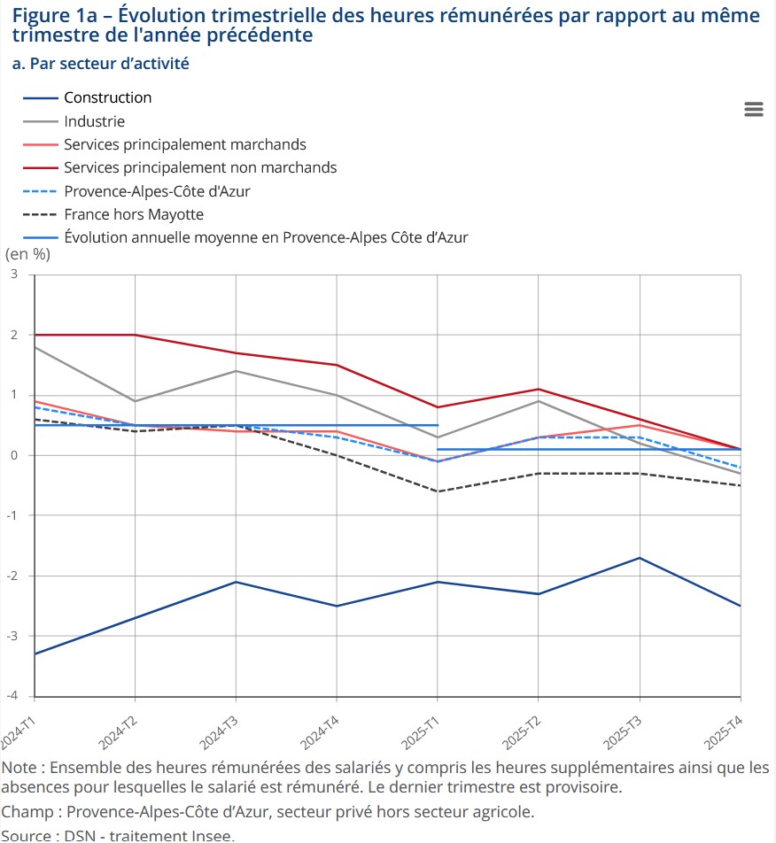 A noter que fin 2025, c’est en Vaucluse (-0,8%) et dans les Alpes-de-Haute-Provence (-0,9%) que l’on enregistre les plus fortes baisses trimestrielles des heures rémunérées.