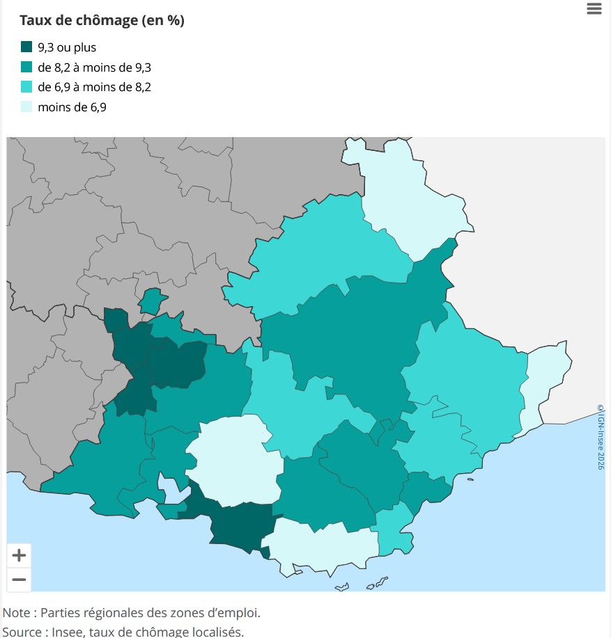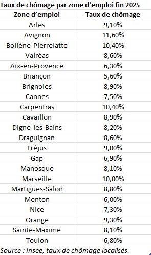 L’Insee Paca vient de publier la synthèse annuelle économique régionale 2025. Réalisée par Julie Argouarc’h et Corinne Roche, cette étude constate notamment que dans la région, l’activité économique décélère, tout en demeurant supérieure au niveau national. La croissance de l’emploi ralentit également et le taux de chômage remonte à 8,4 % fin 2025 après le point bas de 2024. Dans ce contexte, les zones d’emploi de Vaucluse affichent les plus mauvais taux de la région. Toutefois, au niveau régional les dépôts de bilan d’entreprises diminuent après trois années de forte hausse et l’encours de crédits bancaires repart à la hausse.