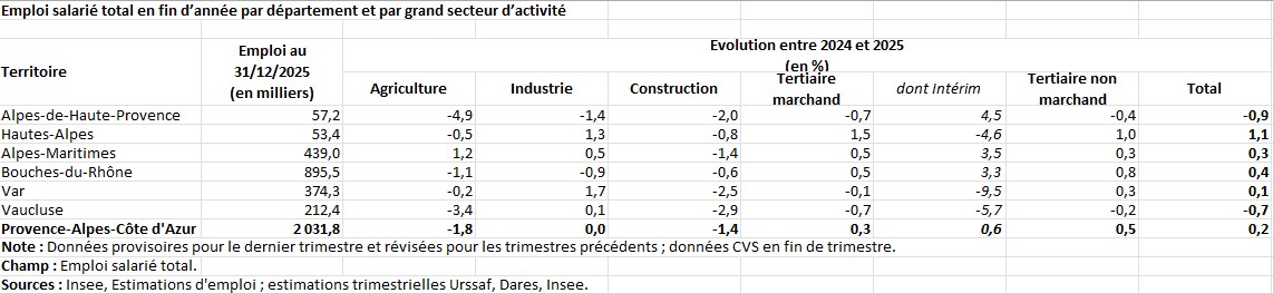 « Avec 172 400 salariés (hors intérim) fin 2025, soit 9% des salariés de la région, l’emploi dans l’industrie en Provence-Alpes-Côte d’Azur se maintient après huit années de hausses consécutives (+1,3% en 2024), avec un effectif comparable à celui d’il y a vingt ans. En France, l’industrie connaît une baisse des salariés de 0,5% fin 2025 après +0,4 % fin 2024. En 20 ans, l’emploi industriel a baissé de 13% en France. Les secteurs du tertiaire marchand représentent plus de la moitié de l’emploi salarié de la région. Fin 2025, en excluant l’intérim qui repart à la hausse (+0,6 %), l’emploi du tertiaire marchand progresse de 0,3%, après +0,7%. Cette croissance repose notamment sur l’hébergement-restauration (+2,2 %), les transports (+0,7%) et les services aux entreprises (+0,6%). À l’inverse, le recul important des services immobiliers (-1,6%) pèse sur l’évolution globale du secteur. »