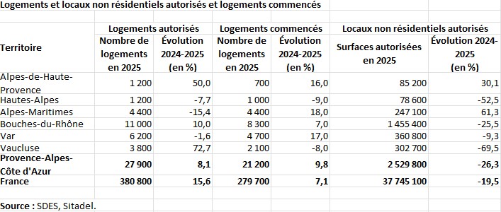 « Au niveau national, le tertiaire marchand recule en 2025 (-0,4% après +0,7% en 2024). L’activité du tertiaire non marchand privé reste dynamique en 2025, avec une progression de 0,7% dans la région, mais elle est également en retrait par rapport à 2024 (+1,8%). Cette dynamique est similaire à celle observée au niveau national (+0,5% en 2025 après +1,6% en 2024). La construction reste en difficulté en 2025, poursuivant la tendance négative engagée en 2023, tant en Provence-Alpes-Côte d’Azur qu’au niveau national. Dans la région, les heures rémunérées du secteur reculent de 2,1%, après -2,7% en 2024. En France (hors Mayotte), la baisse dans ce secteur ralentit également : -1,7% après -2,6% en 2024. »