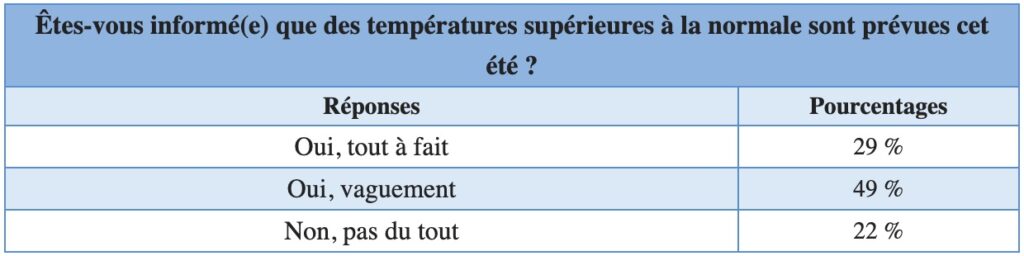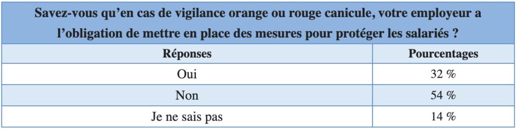 Mais vu qu’il reste technique et très récent, 54% des Français ignorent que leur employeur a une obligation d’agir en cas d’alerte canicule. À noter également que 14% ne savent pas répondre à cette question.