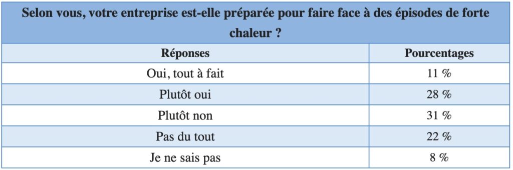 Ainsi, 53% estiment que leur entreprise n’est pas prête pour gérer efficacement des épisodes de forte chaleur : 31% plutôt pas et 22% pas du tout.
