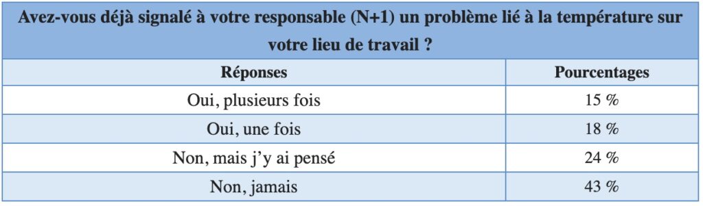 Pour remédier à cet inconfort, une première étape serait d’en parler. Car 67% des Français n’ont jamais signalé à leur supérieur un problème lié à la température sur leur lieu de travail. Dans le détail, 24% y ont pensé mais sans le faire et 43% n’ont jamais exprimé quoi que ce soit.