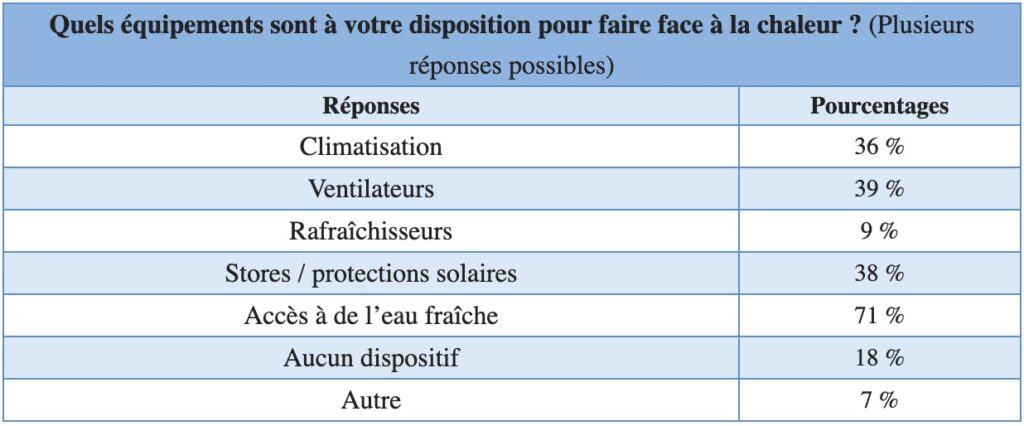 Parmi toutes les solutions possibles afin de supporter des températures plus élevées, l’accès à de l’eau fraîche est le dispositif le plus répandu cité par 71% des Français. Les ventilateurs (39%) et les protections solaires (38%) apparaissent comme des solutions assez fréquentes, car moins coûteuses et plus faciles à déployer que la climatisation (36%).