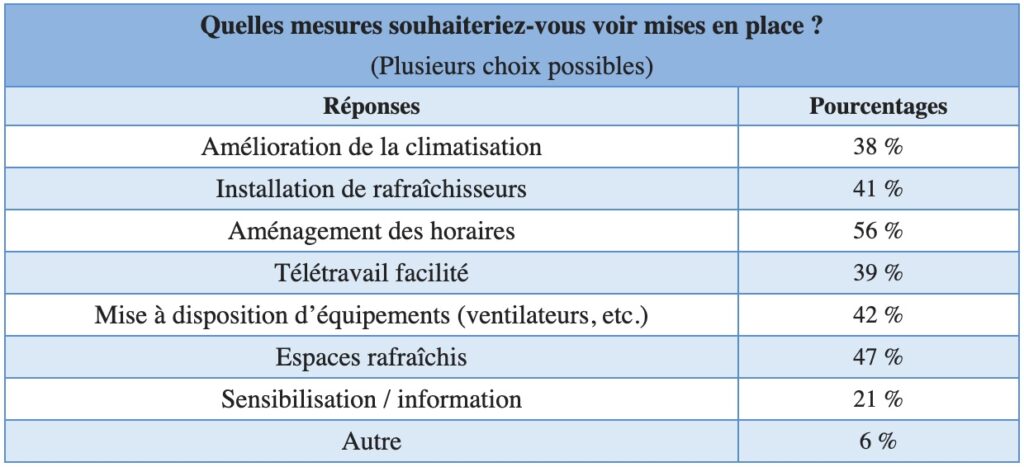 Les attentes des Français iraient d’abord vers des mesures faciles à mettre en place comme l’aménagement des horaires (56%) pour éviter les heures les plus chaudes, fournir des équipements simples (42%) ou prévoir des espaces rafraîchis (47%).