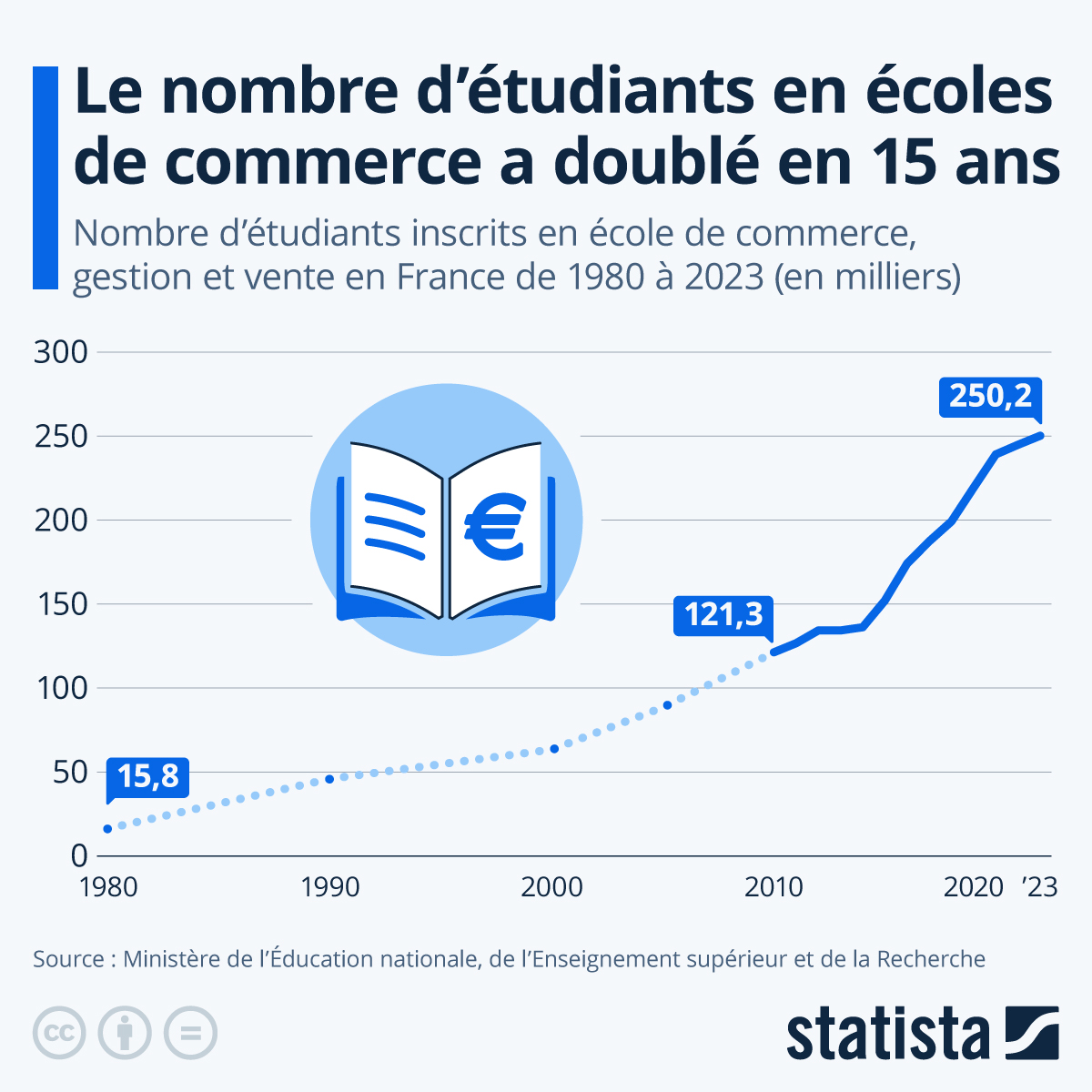 Selon les données ministère de l’Éducation nationale, de l’Enseignement supérieur et de la Recherche, on dénombrait ainsi seulement 16 millions d’étudiants dans les écoles de commerce, gestion et vente françaises en 1980. Ce chiffre était passé à 63 millions pour la rentrée 2000-2001, puis à 121 millions dix ans plus tard, avant d’atteindre plus de 250 millions en 2023-2024, soit une multiplication par quatre des effectifs environ depuis le début du 21e siècle.