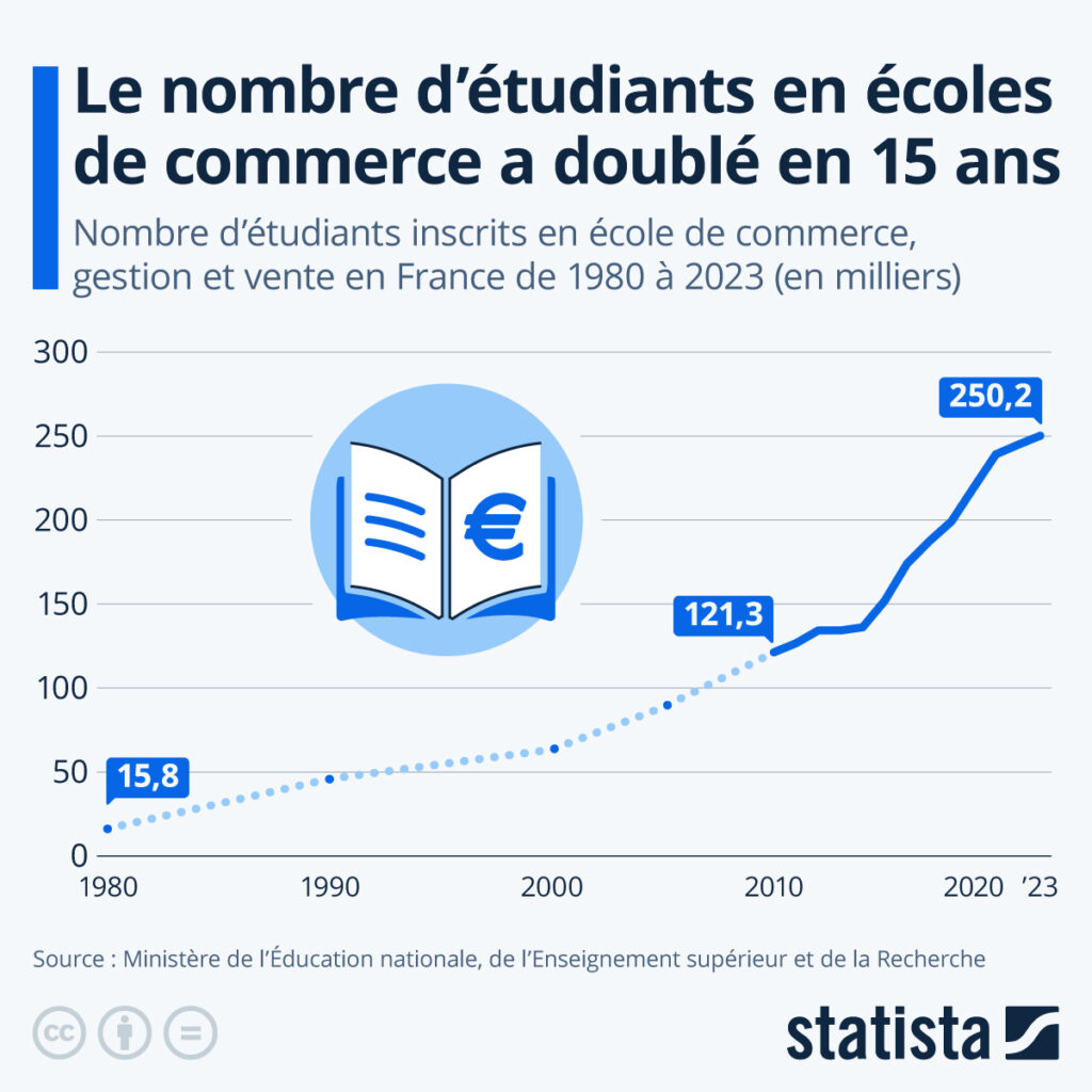Selon les données ministère de l’Éducation nationale, de l’Enseignement supérieur et de la Recherche, on dénombrait ainsi seulement 16 millions d’étudiants dans les écoles de commerce, gestion et vente françaises en 1980. Ce chiffre était passé à 63 millions pour la rentrée 2000-2001, puis à 121 millions dix ans plus tard, avant d’atteindre plus de 250 millions en 2023-2024, soit une multiplication par quatre des effectifs environ depuis le début du 21e siècle.