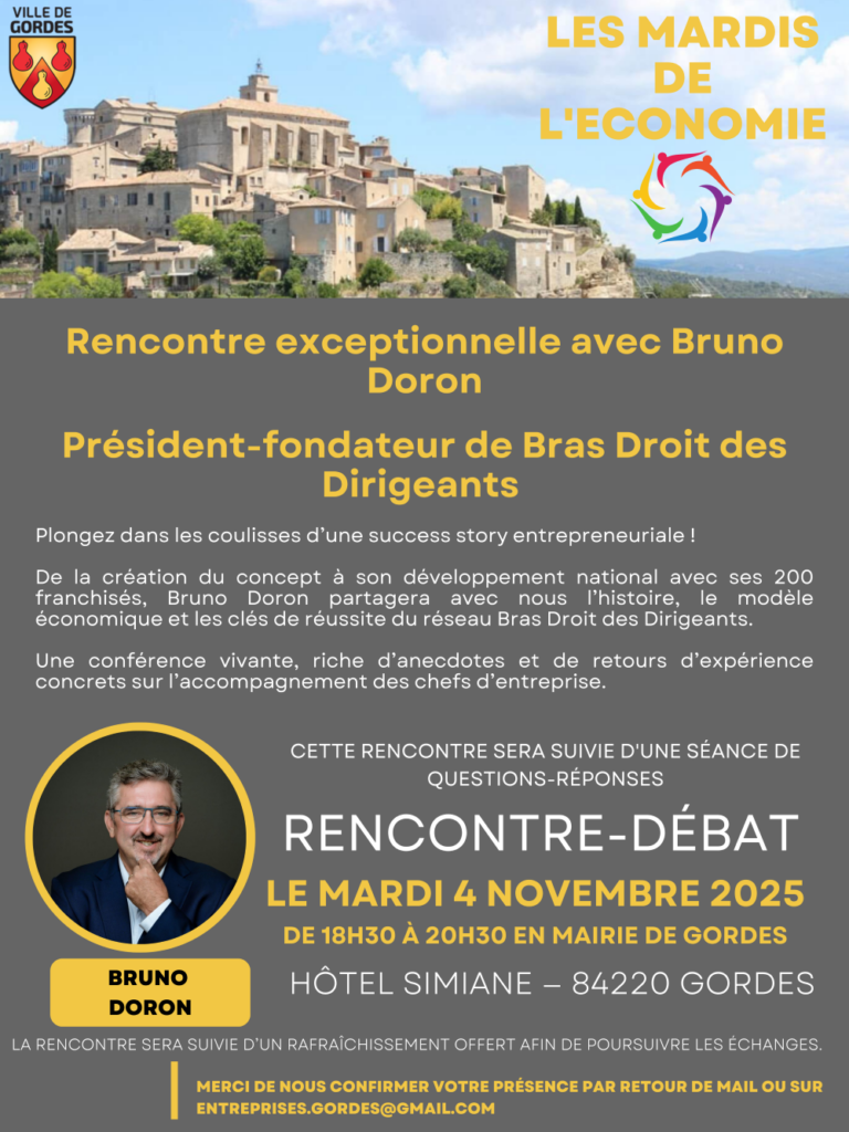Ce mardi 4 novembre, venez à la rencontre avec Bruno Doron, président-fondateur de Bras Droit des Dirigeants (BDDD), à Gordes. À l’occasion du prochain Mardi de l’économie qui se tiendra en mairie de Gordes à l’Hôtel Simiane, les entrepreneurs, mais aussi les particuliers, sont invités à se rendre à une conférence-débat en présence du maire de 18h30 à 19h30.