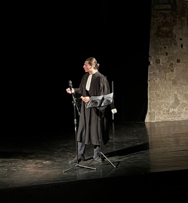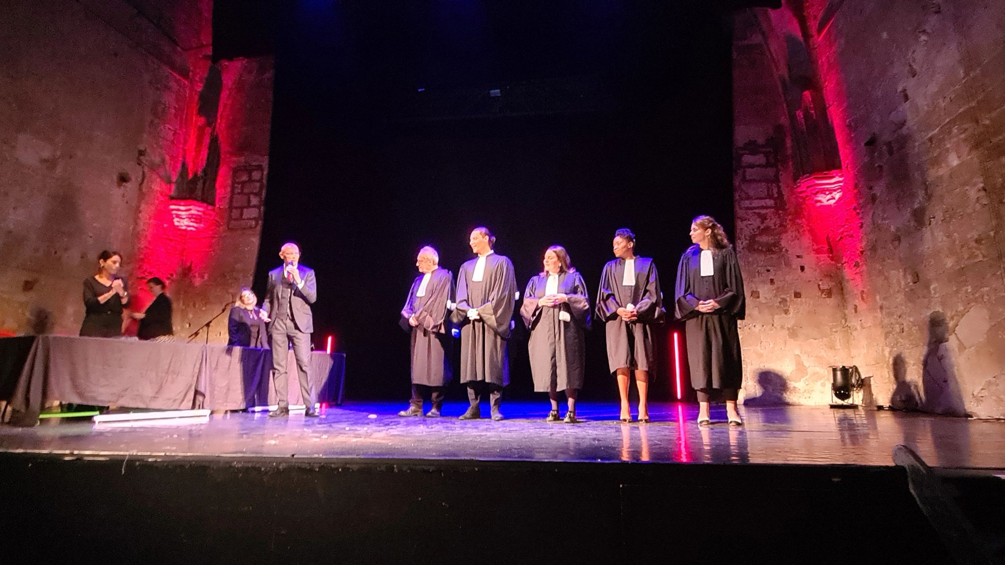 Entre théâtre et droit, c’est devant une salle comble que se sont mesurés : Maître Emmanuelle Viallet du barreau d’Avignon, Maître Clémence Thibaud du barreau de Carpentras), Maître Emilie Ridarch du barreau de Tarascon, Maître Marc André du barreau d’Alès ainsi que le futur vainqueur désigné par le jury préside pour l’occasion par Jean-Philippe Lejeune, président du Tribunal judiciaire d’Avignon.