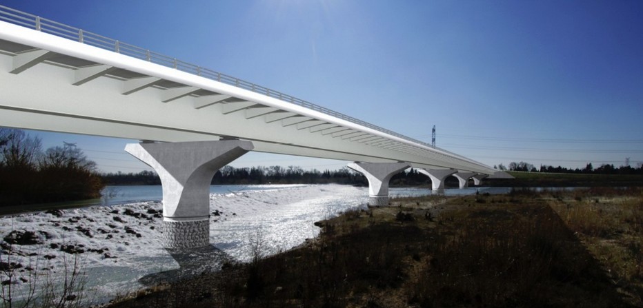 Photomontage depuis la rive droite de l’ouvrage de franchissement de la Durance Amont de la tranche 2 de la LEO. Crédit : Lavigne Cheron Architectes/Cerema