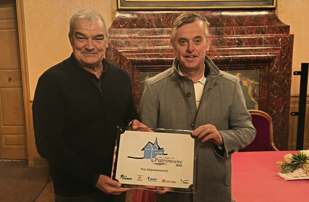 Didier Carles, maire de Pernes-les-Fontaines a reçu un prix départemental des Rubans du Patrimoine 2025, ici aux cotés de Daniel Léonard, président de la Fédération du BTP 84. Le concours distingue es collectivités engagées dans la rénovation de leur patrimoine bâti. Créé en 1995, ce dispositif national a déjà mobilisé plus de 5 500 communes et récompensé près de 2 000 projets, faisant de lui un marqueur fort de la préservation du bâti ancien.