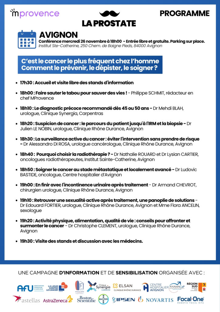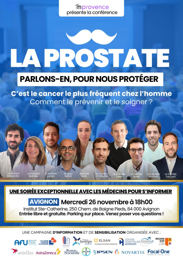 À l’occasion du mois de sensibilisation au cancer de la prostate, une grande conférence ouverte à tous se tiendra le 26 novembre à Avignon. Organisée par Sainte-Catherine et MProvence, cette soirée vise à mieux informer les hommes et leurs proches sur le cancer de la prostate : son dépistage, sa prévention et les avancées thérapeutiques, un enjeu majeur de santé masculine.