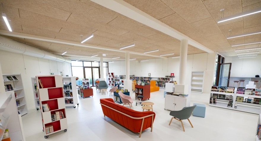 Au cœur du nouveau bâtiment : un magasin de prêt transformé en bibliothèque ‘témoin’. Pensé comme un prototype de bibliothèque municipale moderne, il réunit entre 8 000 et 12 000 documents, dans un cadre ergonomique et flexible. Les collections sont mises en valeur à travers une grande variété de supports – rayonnages, bacs, espaces thématiques – et le mobilier a été entièrement repensé pour créer une ambiance chaleureuse, fluide, et accueillante. Un espace source d’inspiration pour les bibliothèques du territoire, qui y puisent des idées concrètes pour faire évoluer leurs propres équipements.
