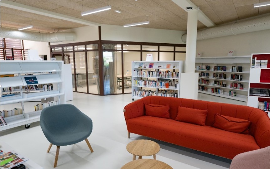Au cœur du nouveau bâtiment : un magasin de prêt transformé en bibliothèque ‘témoin’. Pensé comme un prototype de bibliothèque municipale moderne, il réunit entre 8 000 et 12 000 documents, dans un cadre ergonomique et flexible. Les collections sont mises en valeur à travers une grande variété de supports – rayonnages, bacs, espaces thématiques – et le mobilier a été entièrement repensé pour créer une ambiance chaleureuse, fluide, et accueillante. Un espace source d’inspiration pour les bibliothèques du territoire, qui y puisent des idées concrètes pour faire évoluer leurs propres équipements.